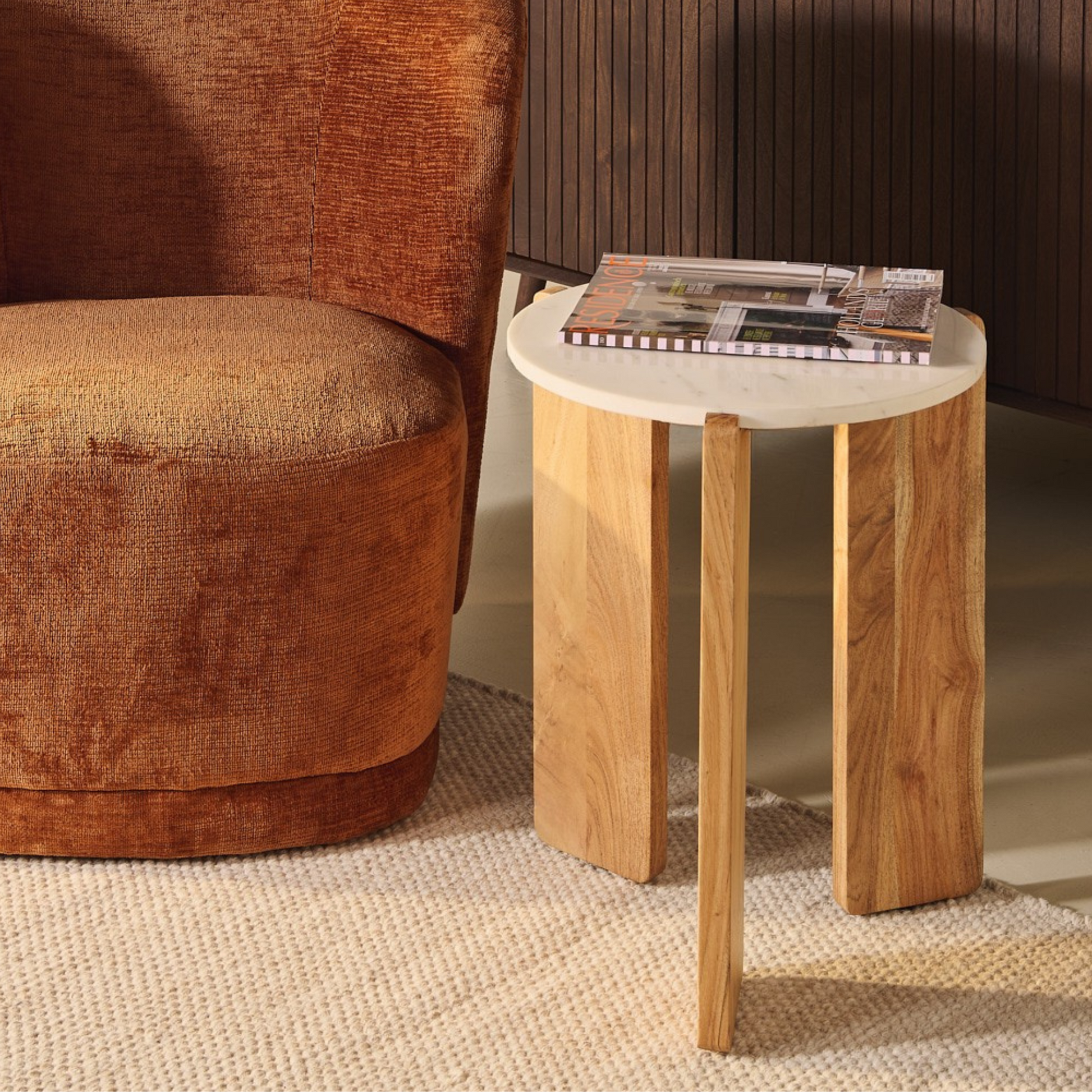 Een zachte harmonie van natuurlijke luxe en verfijnd design. Avelle combineert het subtiele karakter van licht marmer met het warme, organische gevoel van acaciahout. De zachte rondingen en serene kleurstelling maken van deze tafel een stille blikvanger — elegant, ingetogen en tijdloos mooi.