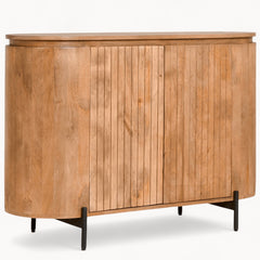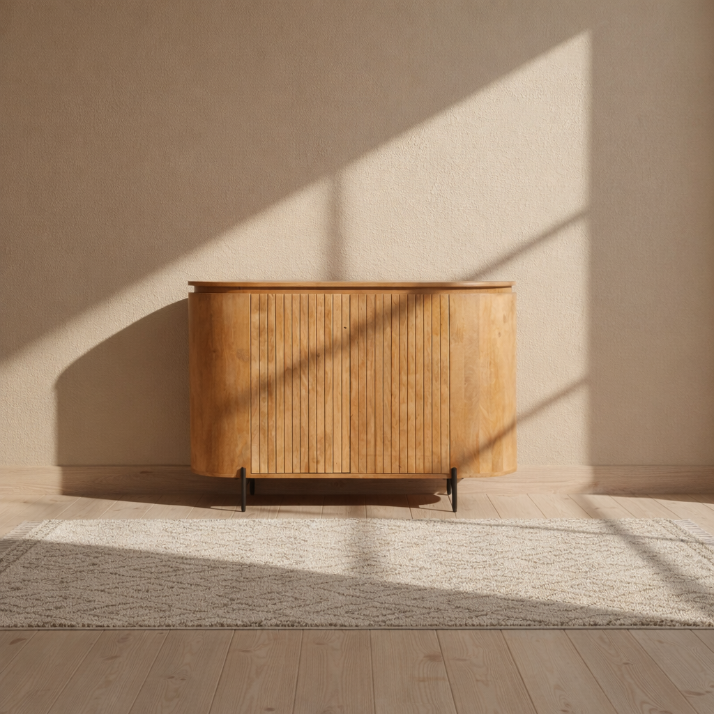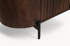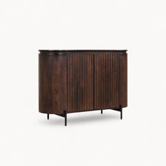 Donker hout, verfijnde verticale belijning en zacht afgeronde hoeken vormen samen een rustig en elegant ontwerp waarin vakmanschap en natuurlijke diepte samenkomen.