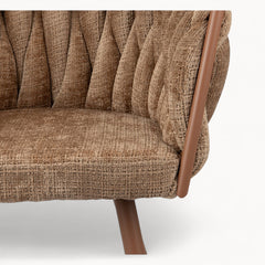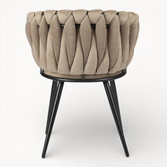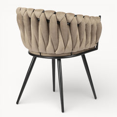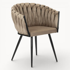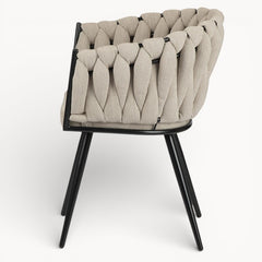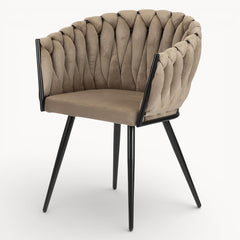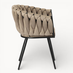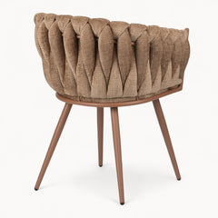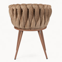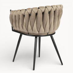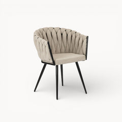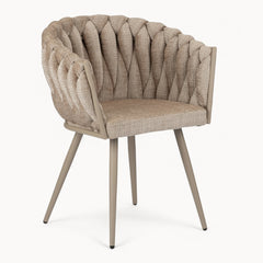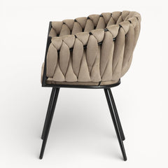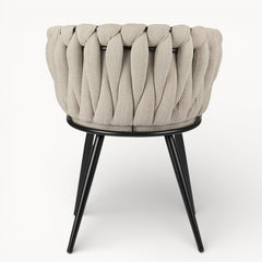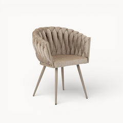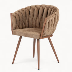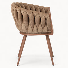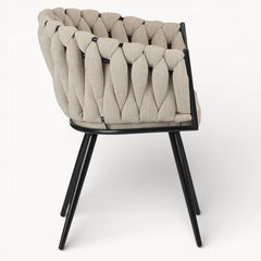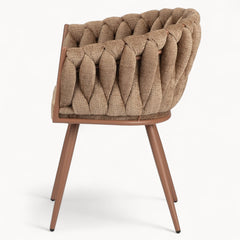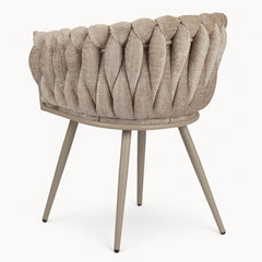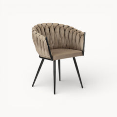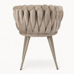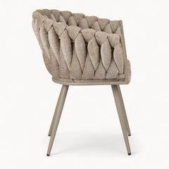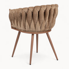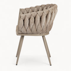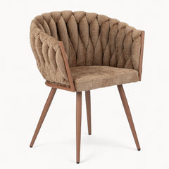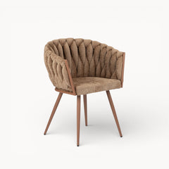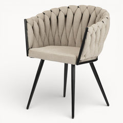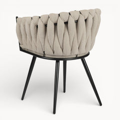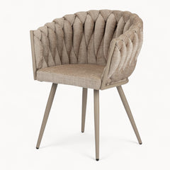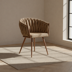 Gevlochten lijnen, tactiele stoffen en een uitgebalanceerd silhouet vormen samen een eetkamerstoel die ambacht en rust moeiteloos verenigt.