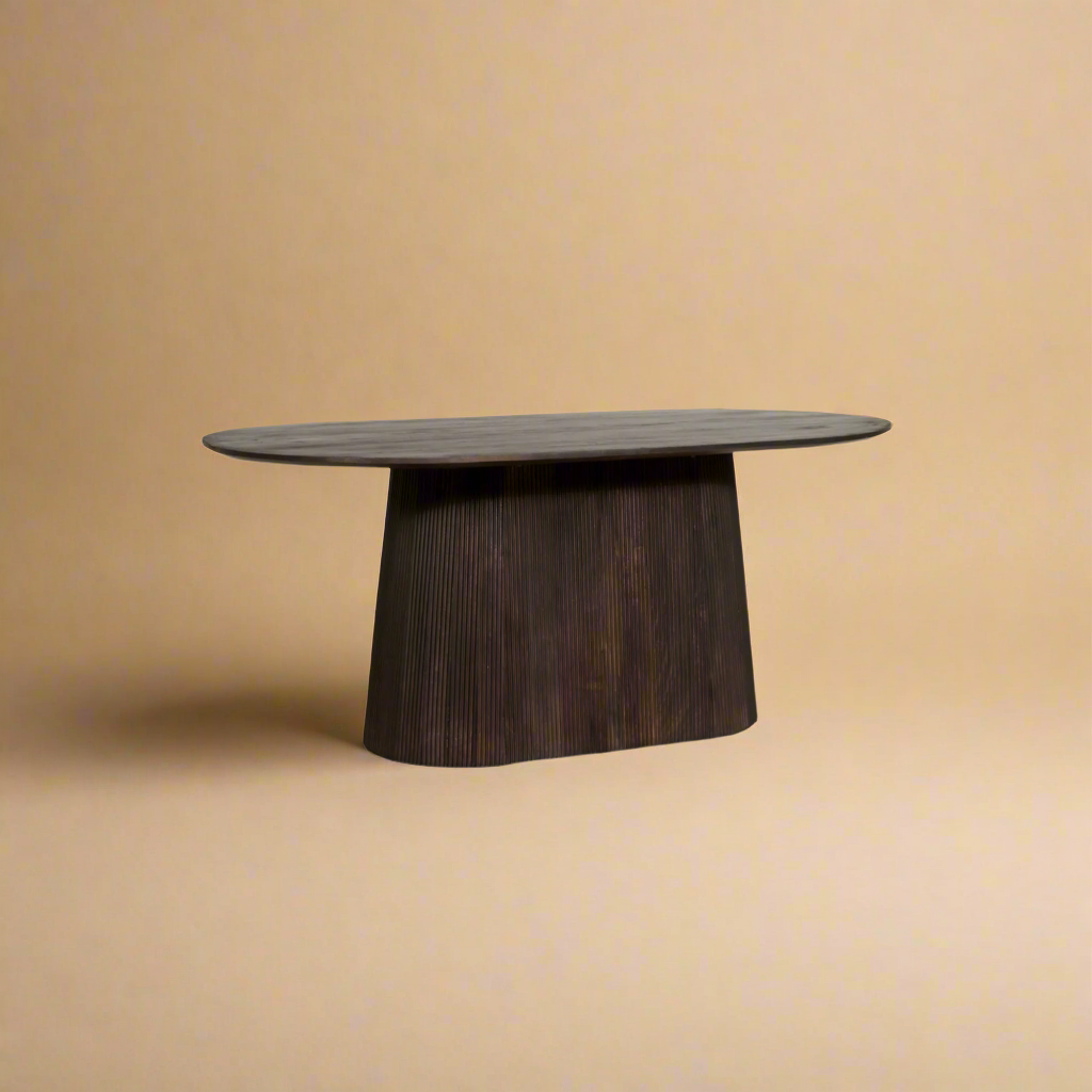 Een tafel die direct charme toevoegt aan je eetruimte. Sorelli in donkerbruin is elegant en krachtig tegelijk, met een opvallend onderstel in geribbeld hout. De ovale vorm zorgt voor een natuurlijke flow in de ruimte. Een ideale keuze voor wie luxe zoekt met een twist van Scandinavische rust.