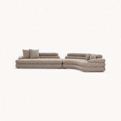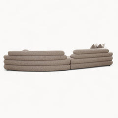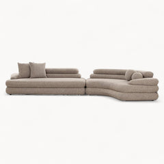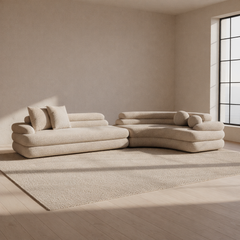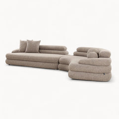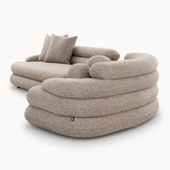 Zachte bouclé, vloeiende volumes en een royale opstelling vormen samen een ingetogen ontwerp dat rust, comfort en tijdloze elegantie uitstraalt.