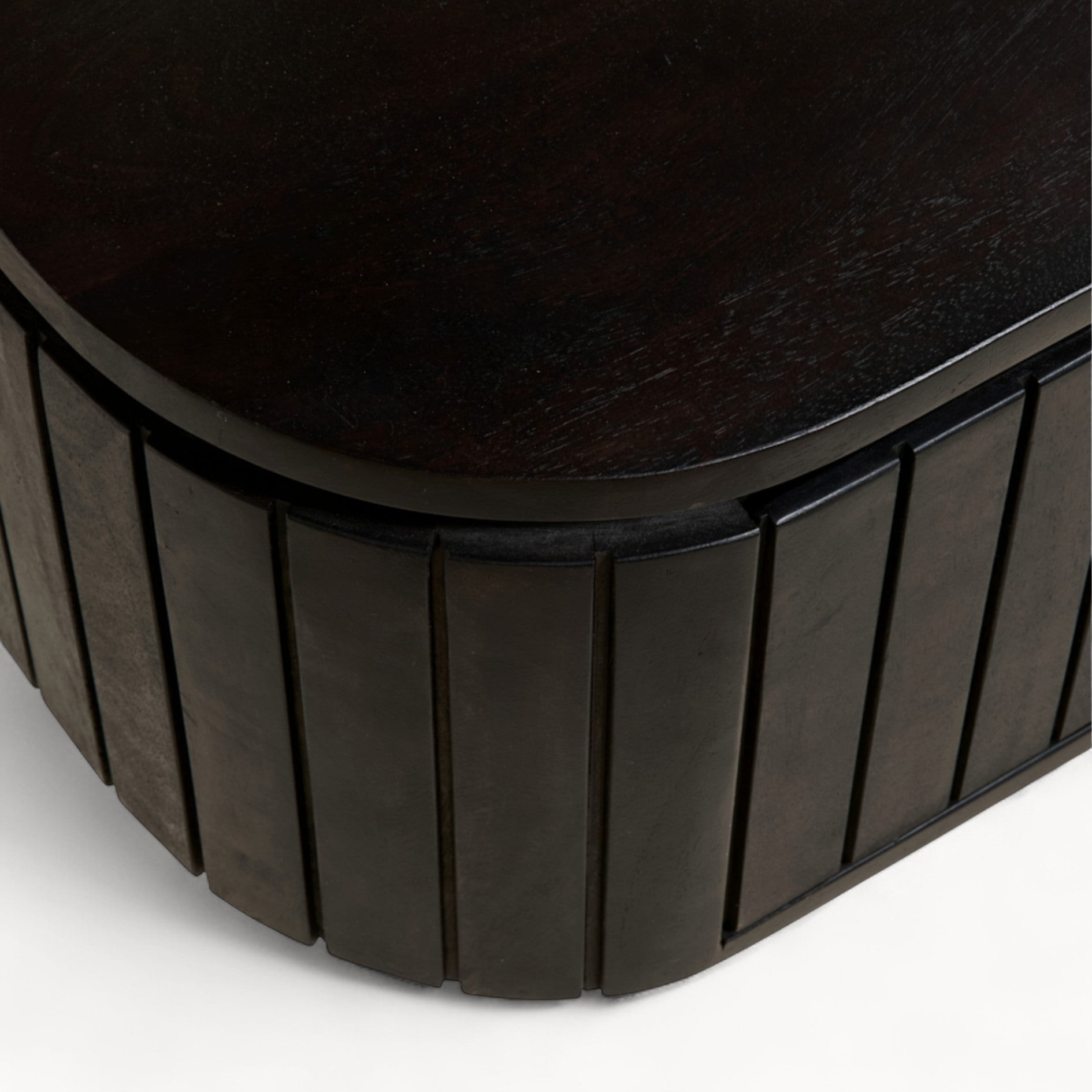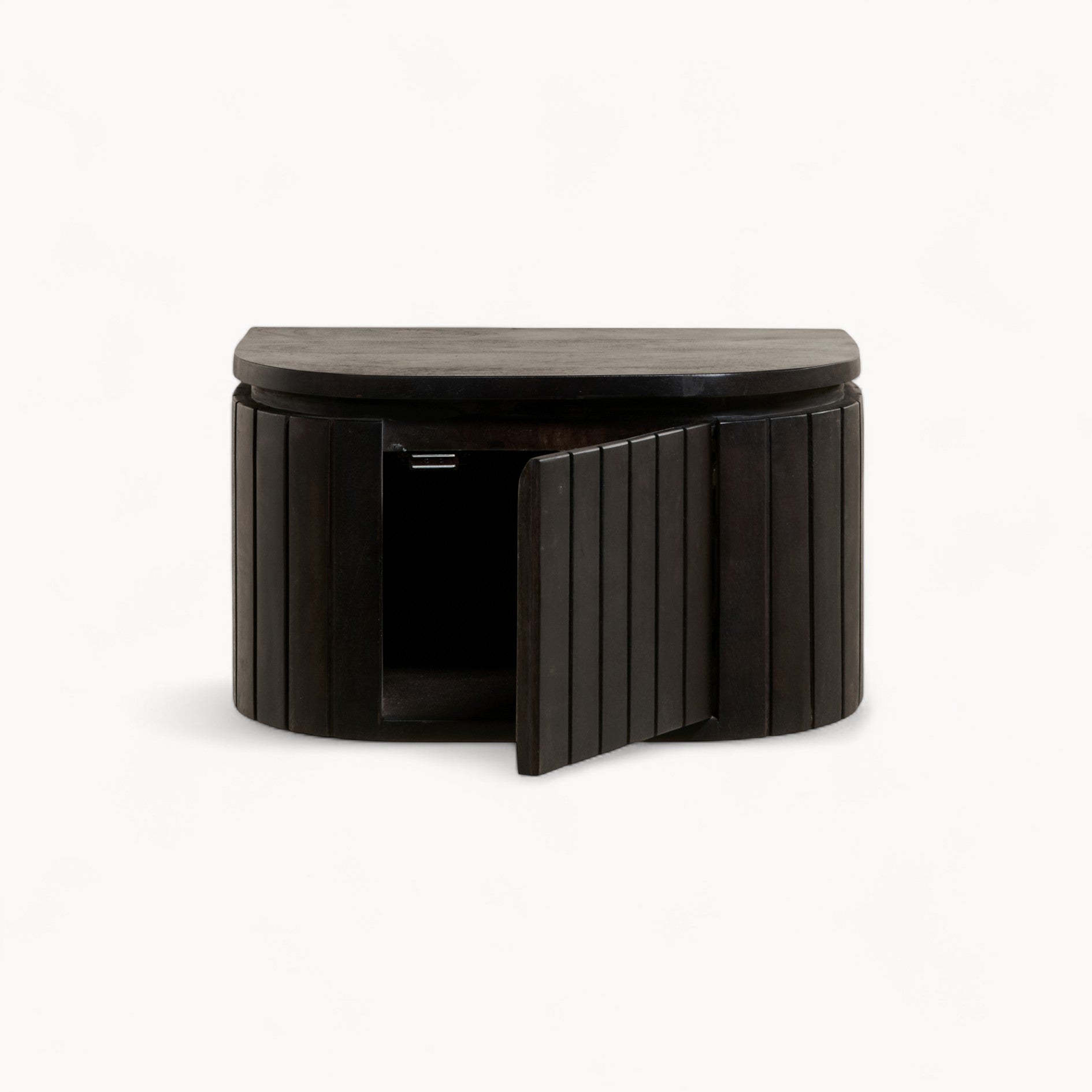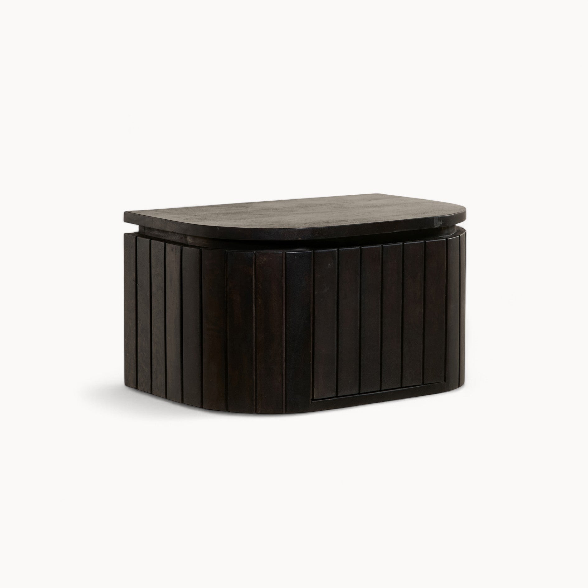 Het hangende Mokka nachtkastje is net zo eigenwijs als handig. Hij hangt stevig aan de muur, waardoor de vloer vrij blijft en je kamer opener lijkt. Ook hier zie je het mangohout met de mooie latjes die licht en schaduw vangen, en de ronde hoeken die het kastje een vriendelijke uitstraling geven. Met zijn 25 x 30 x 45 cm is hij net wat kleiner, maar groot genoeg om achter het deurtje je spullen te bewaren die anders op een stapeltje zouden eindigen. Het bovenblad biedt plek aan je wekker, een leeslampje of gewoon je telefoon. En het fijne: het bevestigingsmateriaal krijg je er direct bij, zodat hij stevig hangt vanaf het eerste moment. Je kunt kiezen voor donkerbruin of lichtbruin, precies wat het beste past bij hoe jij je slaapkamer het liefst ziet. Het Mokka nachtkastje hangt er niet zomaar, het maakt de ruimte echt af.