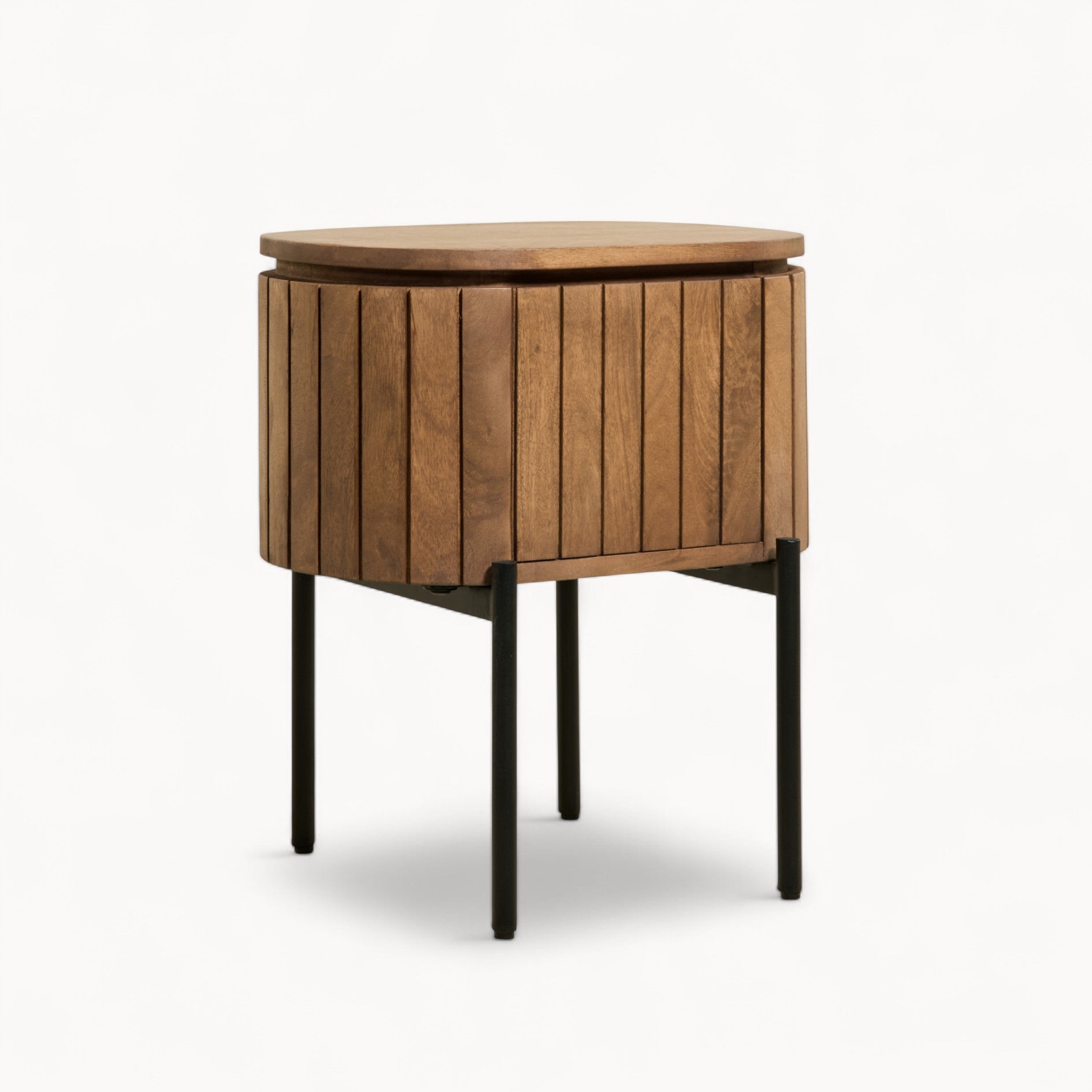Alsof hij er al jaren stond, zo natuurlijk voegt het Mokka nachtkastje zich in je slaapkamer. Gemaakt van mangohout dat nog net een beetje leeft, met die karakteristieke latjes aan de voorkant die je direct herkent. De hoeken zijn rond, geen scherpe lijnen, alles oogt zacht en vriendelijk. Hoog genoeg voor je boek of dat glas water dat je daar altijd neerzet. Achter het deurtje kun je moeiteloos je opladers, notities of leesbril kwijt. Het kastje rust op ronde metalen pootjes die het optillen van de grond, zodat het lijkt alsof hij bijna zweeft. Er zijn twee tinten: donkerbruin als je kamer wel wat extra warmte kan gebruiken, lichtbruin als je liever een frisse, rustige basis hebt. Hoe dan ook, je hebt meteen het gevoel dat hij bij je hoort.
