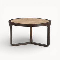 Een ronde salontafel met een natuurlijke en rustige uitstraling.