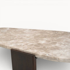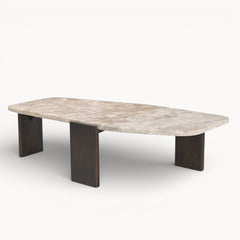 Een robuuste salontafel met zachte lijnen en een rustige uitstraling.