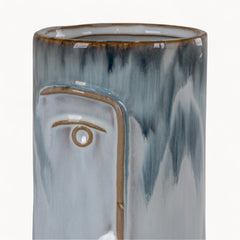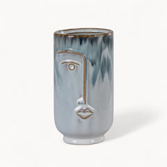Handgeschilderd porselein en diepe blauwtinten vormen samen een expressief object dat karakter en creativiteit subtiel toevoegt aan een rustige ruimte.
