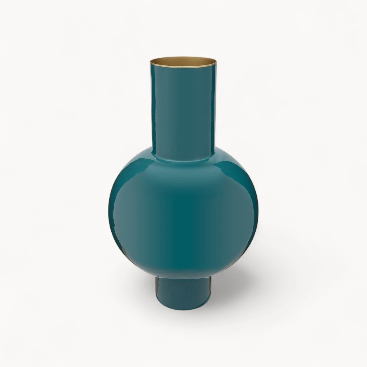 Het strakke en stijlvolle ontwerp van deze metalen vaas voegt een vleugje verfijning toe aan elke kamer, of het nu op een schoorsteenmantel, bijzettafel of als middelpunt op uw eettafel wordt getoond. De veelzijdigheid ervan maakt het mogelijk om naadloos te mengen met verschillende decoratiestijlen, van modern en minimalistisch tot eclectisch en bohemien.