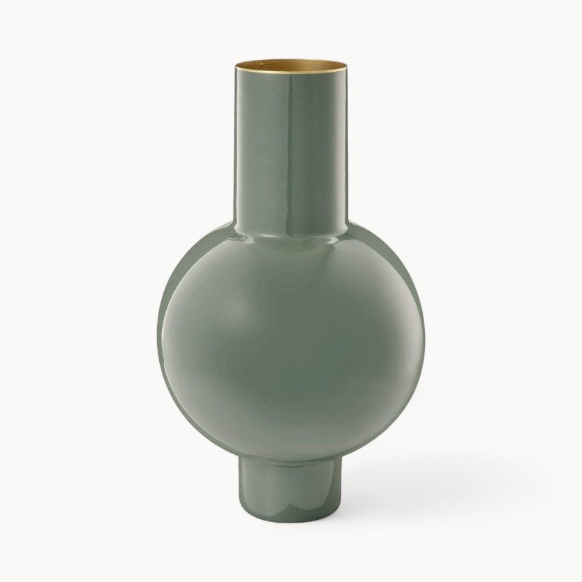 Het strakke en stijlvolle ontwerp van deze metalen vaas voegt een vleugje verfijning toe aan elke kamer, of het nu op een schoorsteenmantel, bijzettafel of als middelpunt op uw eettafel wordt getoond. De veelzijdigheid ervan maakt het mogelijk om naadloos te mengen met verschillende decoratiestijlen, van modern en minimalistisch tot eclectisch en bohemien.